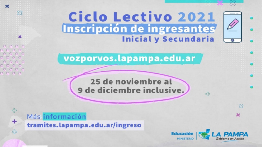 El Ministerio de Educación de La Pampa informó que, desde hoy y hasta el 9 de diciembre inclusive, aquellas familias que tengan a cargo niños, niñas y/o adolescentes que ingresarán el próximo año a salas de 4 años de nivel Inicial y 1er año de nivel Secundario, deberán inscribirlos/as de manera virtual a través del sistema informático “Voz por Vos”.