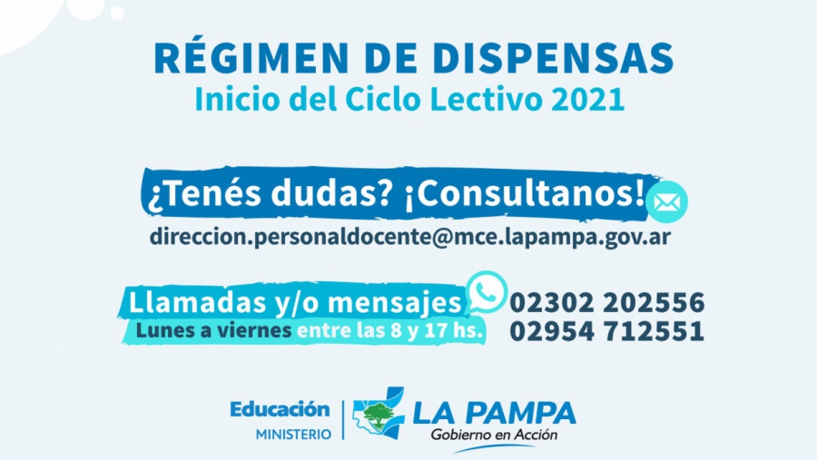 El Ministerio de Educación de La Pampa informó que, en el sitio web https://tramites.lapampa.edu.ar/personaldocente/, se encuentran disponibles respuestas a preguntas frecuentes sobre dispensa por cuidado de menores a cargo en niveles de escolaridad obligatoria prevista en el Decreto Provincial N° 294/21.