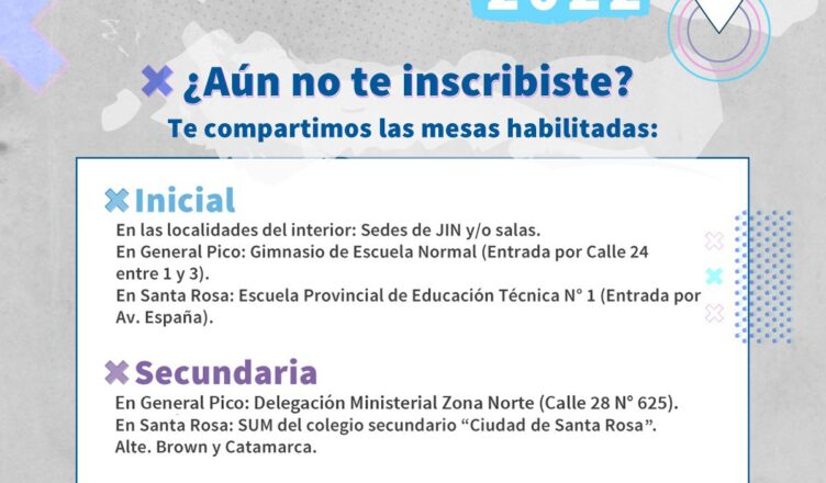 El Ministerio de Educación de La Pampa brindó información sobre el proceso de inscripciones que involucra a niños/as y jóvenes que ingresan a los niveles Inicial y Secundario en el Ciclo Lectivo 2022 y no efectuaron el trámite correspondiente el año pasado.