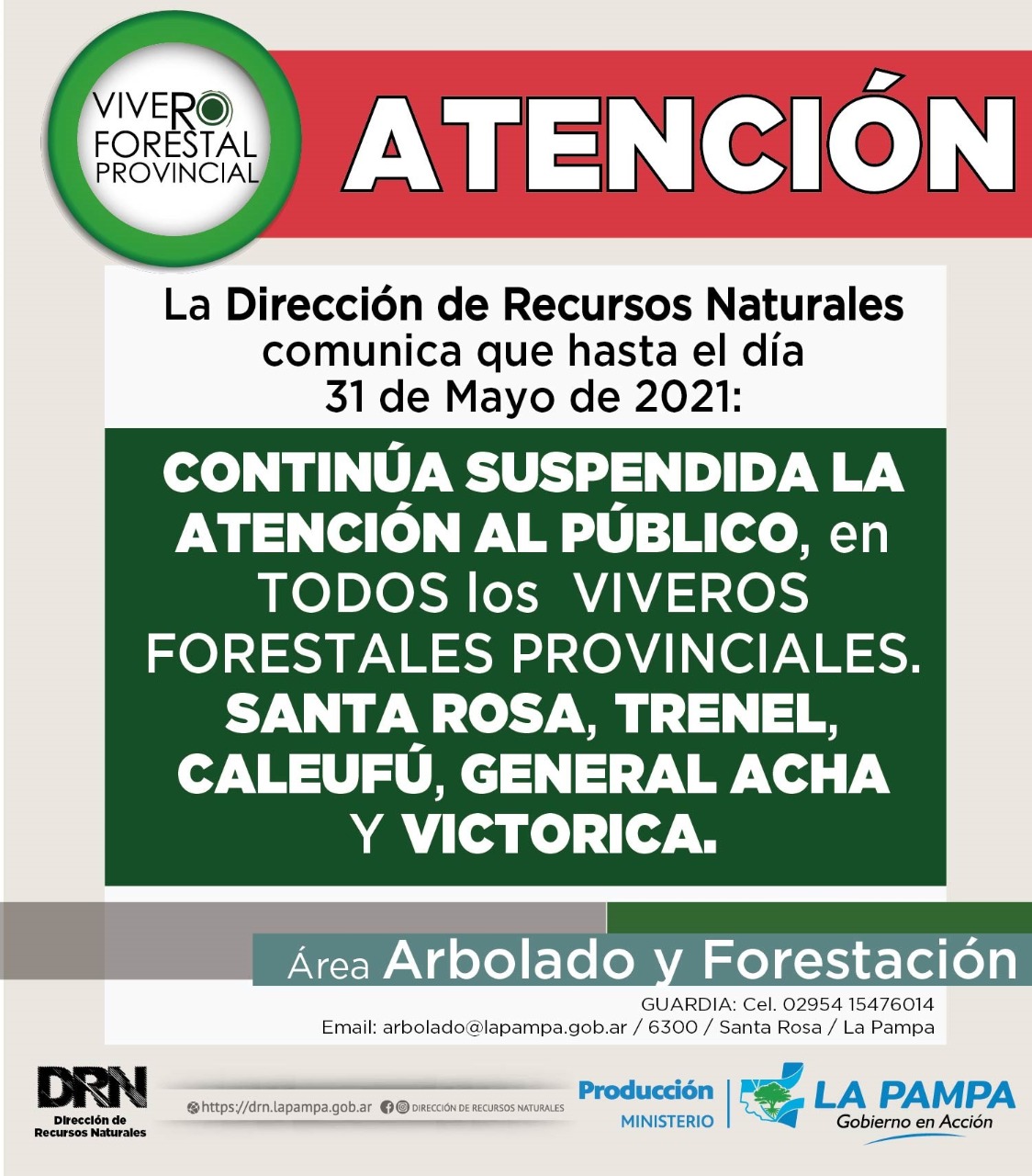 Desde la Dirección de Recursos Naturales, dependiente del Ministerio de la Producción, se informó que continúa suspendida la atención en los Viveros Forestales